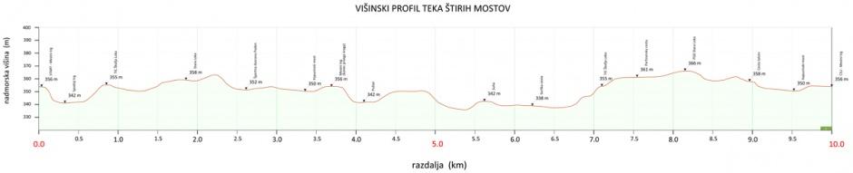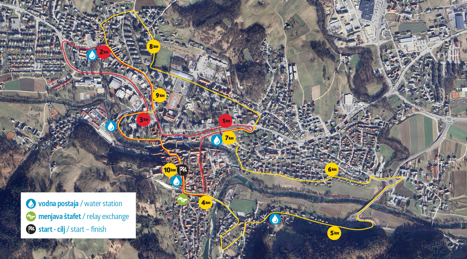 Start 10-kilometrskega Teka štirih mostov bo na Mestnem trgu. Tečemo do konca Mestnega trga in po Pepetovem klancu do Spodnjega trga. Takoj za Kaščo prečkamo Lahov most in nadaljujemo s tekom po klancu do križišča s Kidričevo cesto, kjer zavijemo levo proti avtobusni postaji in mimo Name na Cesto talcev.